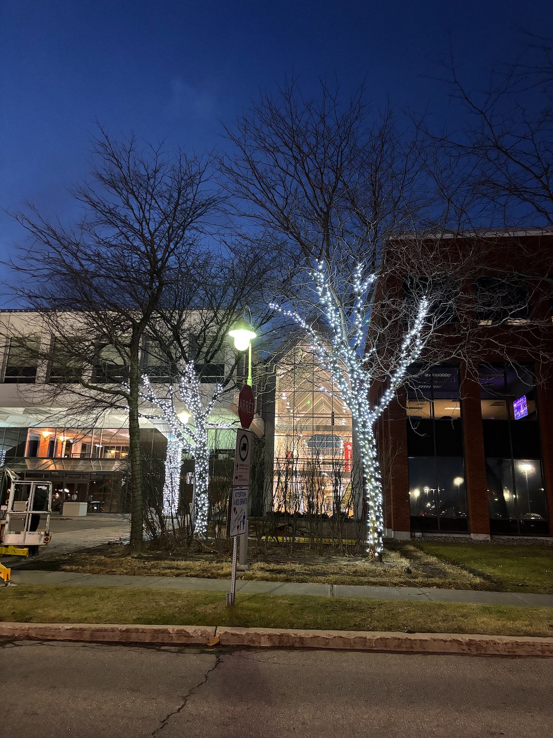 Que ce soit pour un immeuble commercial ou une façade d’entreprise, nous proposons des solutions personnalisées pour chaque besoin. Par exemple, sur ce projet, nous avons installé de petites lumières autour des arbres et des colonnes à l’entrée. Le résultat : une façade élégante, chaleureuse, et prête pour les Fêtes.