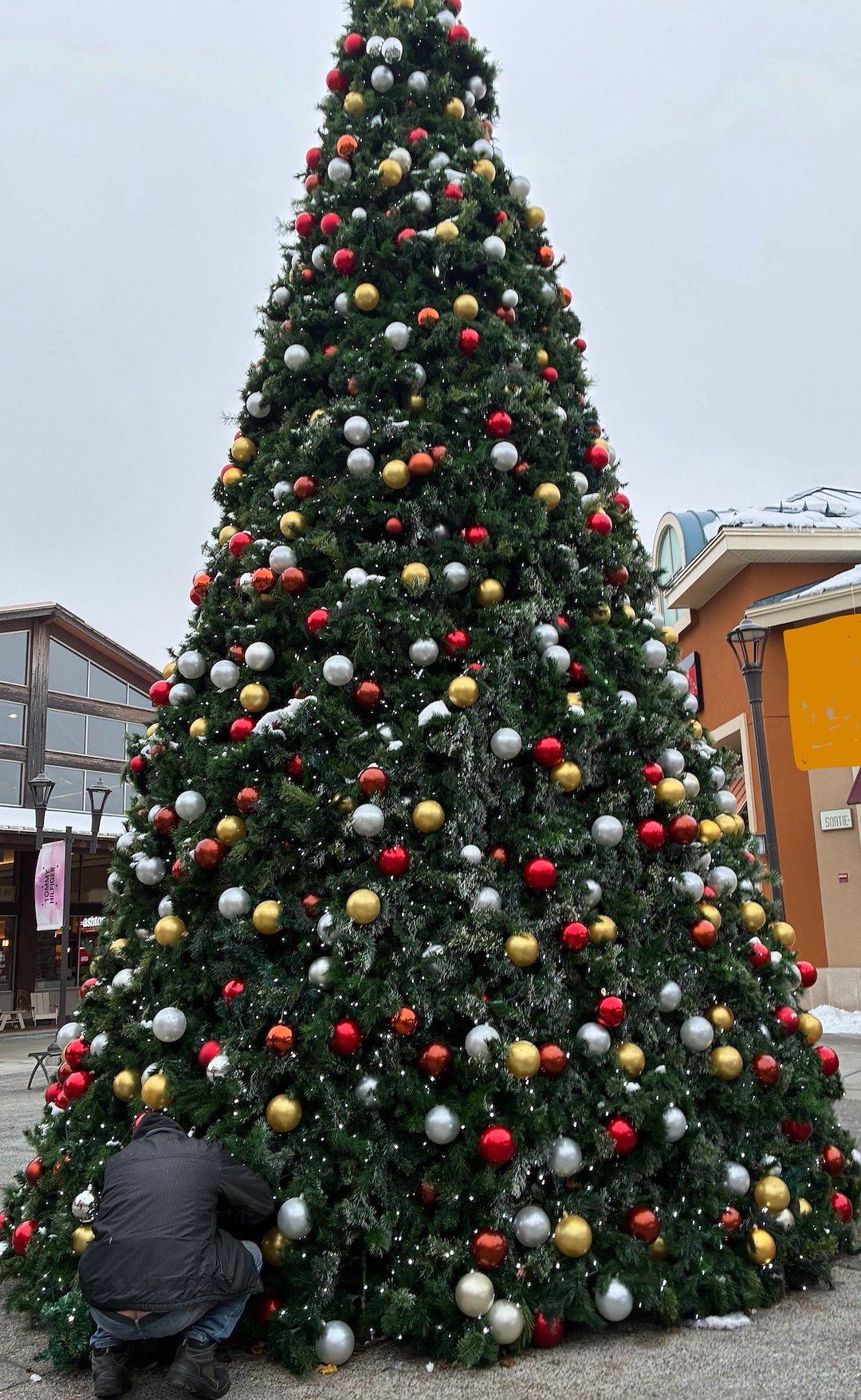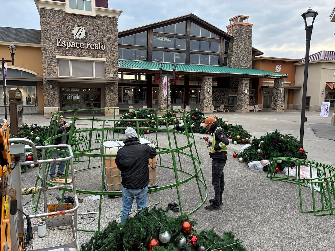 Le sapin de Noël de 30 pieds comportait 175 branches individuelles, chacune équipée de connexions coaxiales pour assurer une résistance complète à l'eau et une sécurité électrique tout au long de la saison des fêtes. Cette approche technique est essentielle pour les décorations de Noël commerciales à Mirabel, où les installations doivent résister aux conditions hivernales du Québec tout en maintenant les normes de sécurité pour les espaces publics. Nous avons sécurisé le sapin dans un grand contenant rempli d'eau, assurant la stabilité et empêchant tout mouvement dans l'aire de restauration à forte circulation. Chaque détail a été soigneusement planifié et exécuté pour créer un spectacle des fêtes époustouflant qui resterait sécuritaire et magnifique tout au long de la saison.